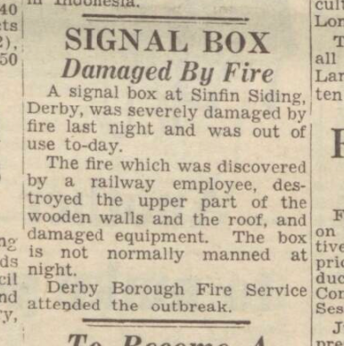 Whilst the Derby Daily Telegraph article doesn't say that the fire which broke out on the evening of Monday 27th February 1950 was arson, there seems every likelihood that it was. In any event, it was clearly a serious enough fire to result in the abolition of the box, with a ground frame substituted in its place to control connections in to the International Combustion factory.